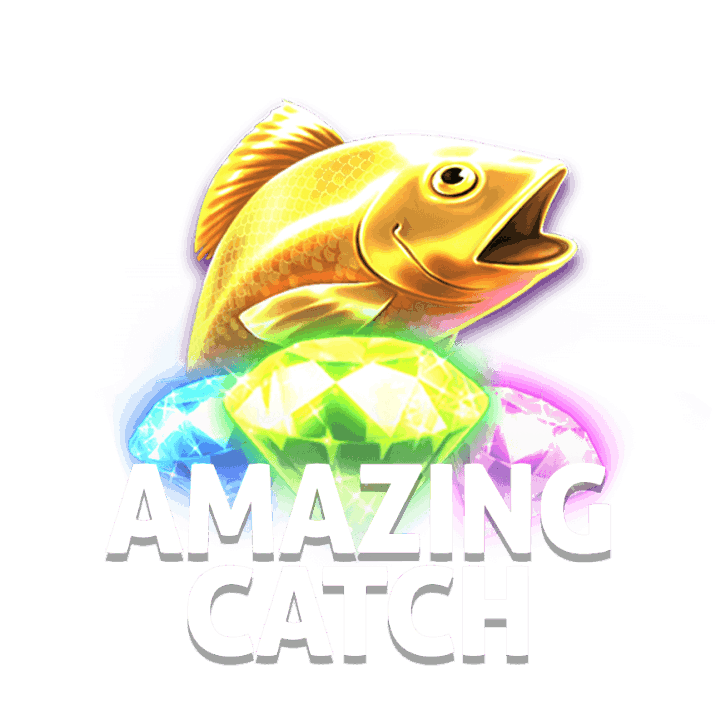 This game showcases a large, colorful fish leaping out of water, emphasizing a fishing and treasure-hunting theme. The visual style is bright and energetic, capturing the thrill of catching rare fish.